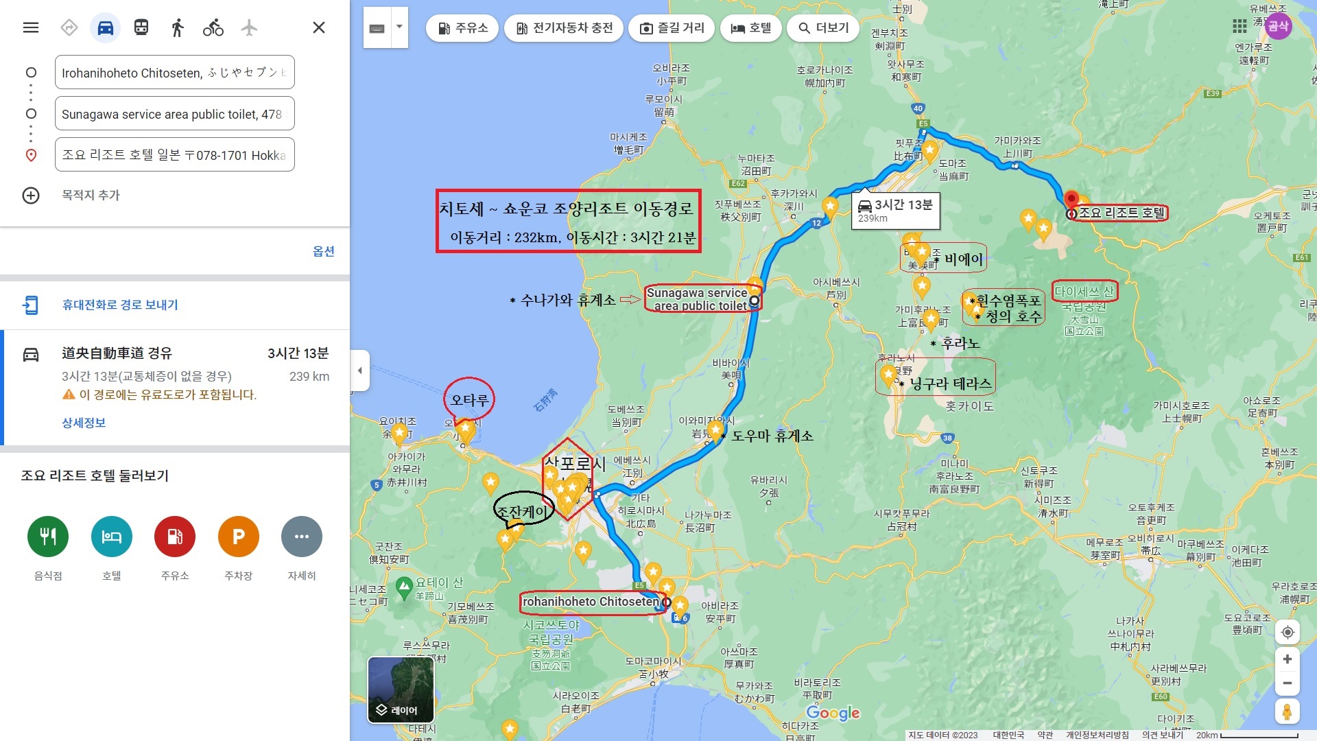 <치토세에서 쇼운코 조양정 리조트 이동 경로>