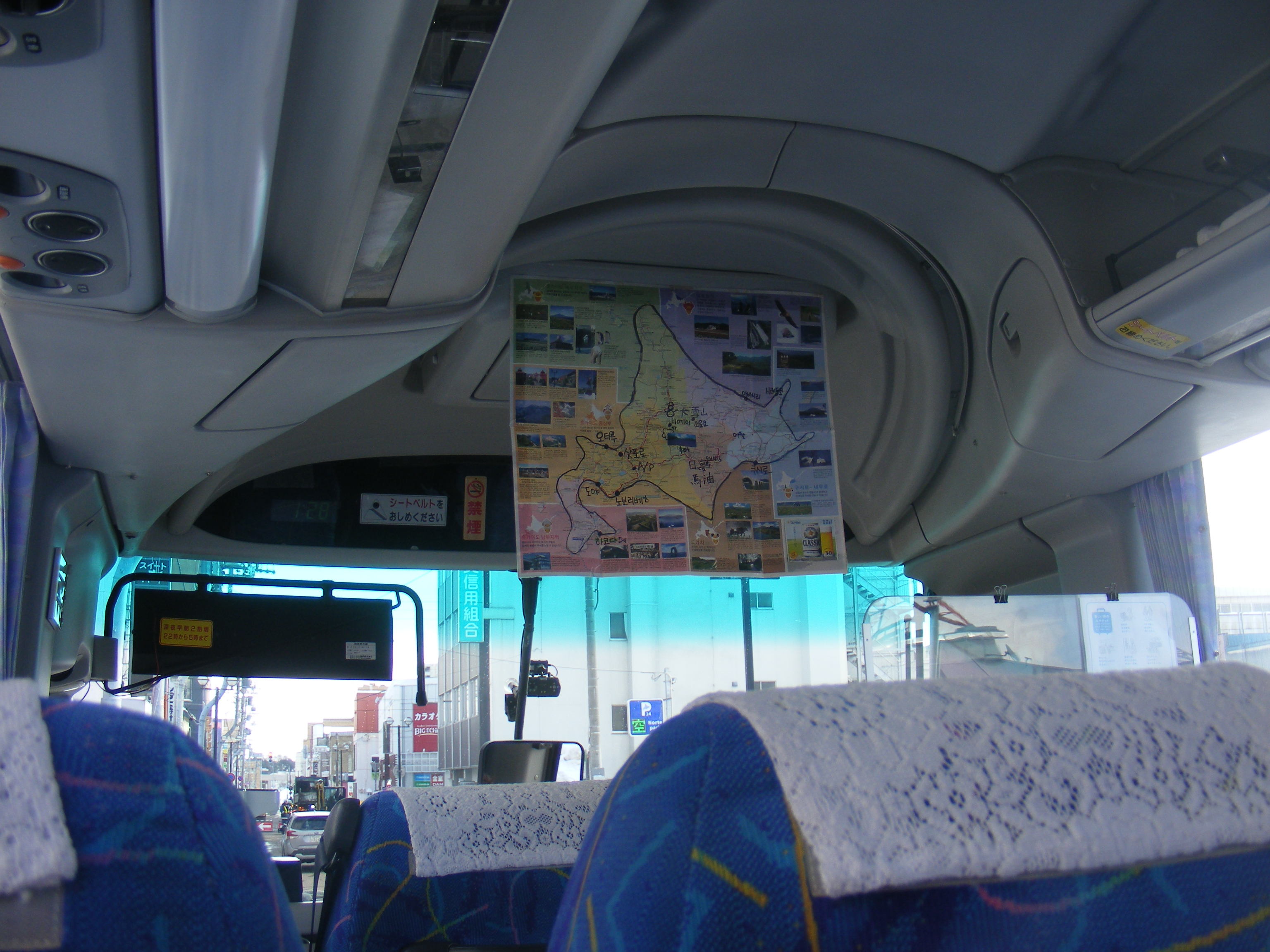우리 가이드님 버스 맨 앞자리에 북해도 전도를 매달아 놓고 이동 중에 일본과 북해도 등에 대한 설명을 해준다.