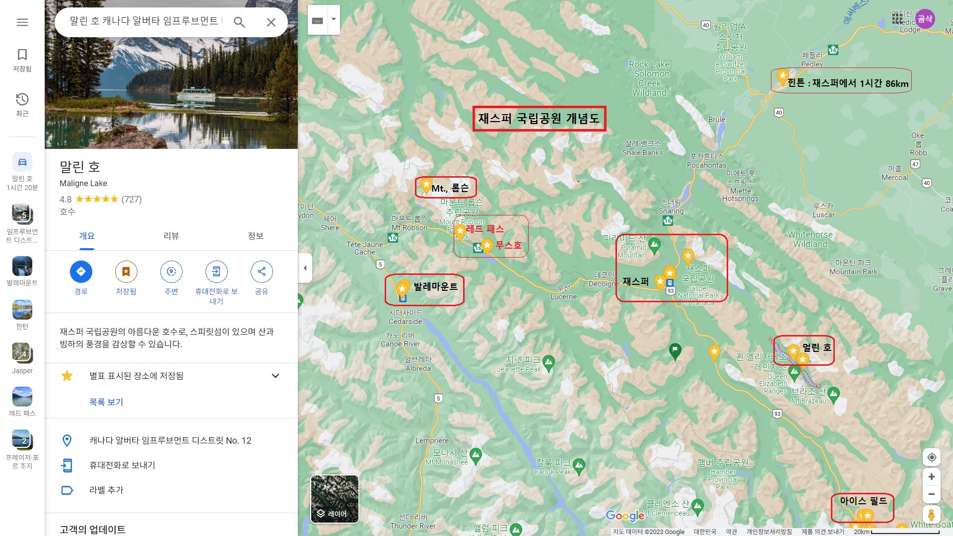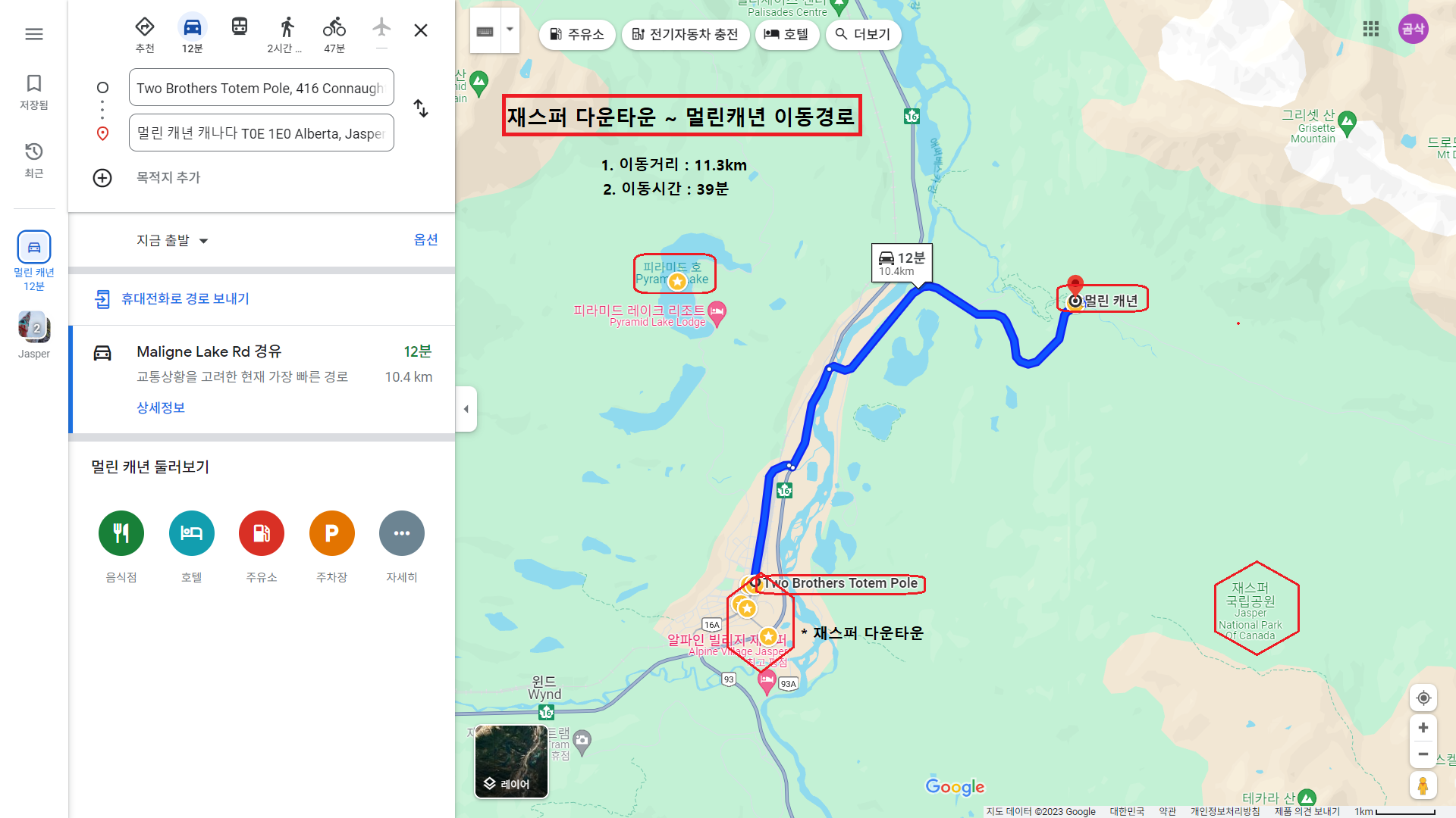 <재스퍼 다운타운 ~ 멀린캐년 이동경로>